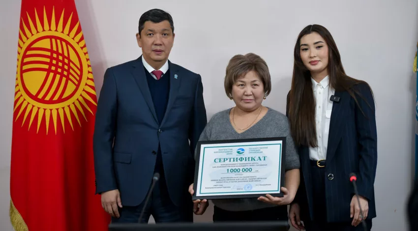 Сертификаты вручили мэр города Бишкек Айбек Джунушалиев и директор Бишкекского филиала Государственной страховой организации Алима Нурланова.